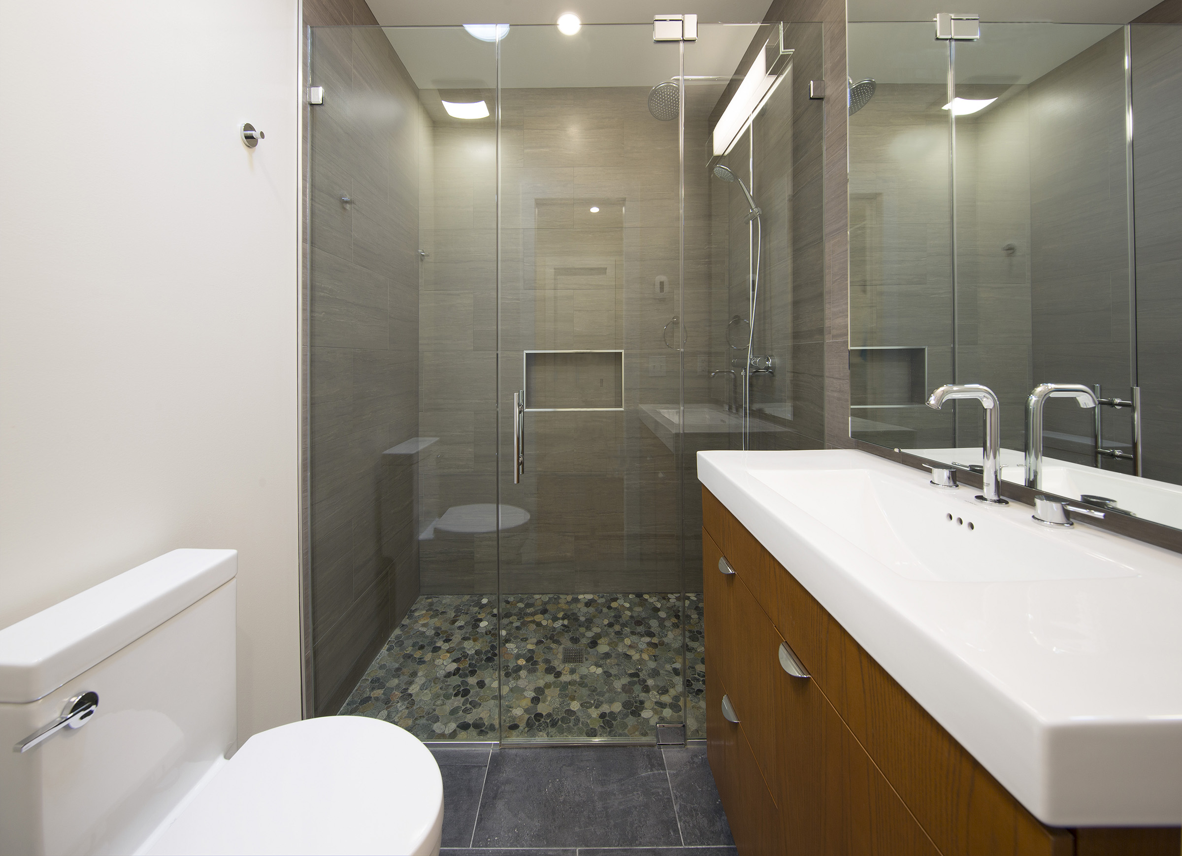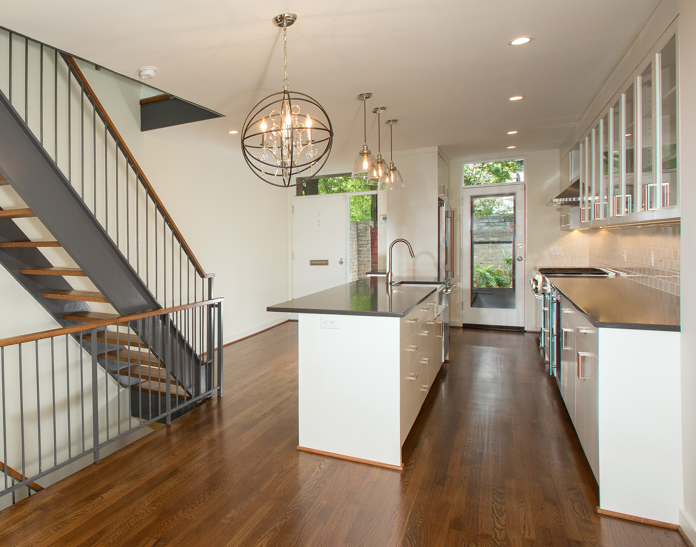 Tiber Island Rowhouse Located within the historic Tiber Island cooperative—an award-winning 1965 modernist development—this rowhouse renovation focused on bringing light, openness, and contemporary functionality to an aging interior. The redesign centered on the homeowners’ love of cooking and entertaining. The first floor was opened up to create a bright, modern kitchen with generous counter space and improved flow. Warm wood flooring and floor-to-ceiling glass panels enhance the sense of space, while a glass door connects the interior to a private courtyard. A streamlined staircase with a steel railing leads to the second level, where the layout was reconfigured to maximize daylight. Bedrooms were positioned along exterior walls with sliding glass doors that open to intimate balconies. Updated bathrooms feature large mirrors, modern fixtures, and glass-enclosed showers, allowing light to move freely and making the spaces feel larger and more refined.